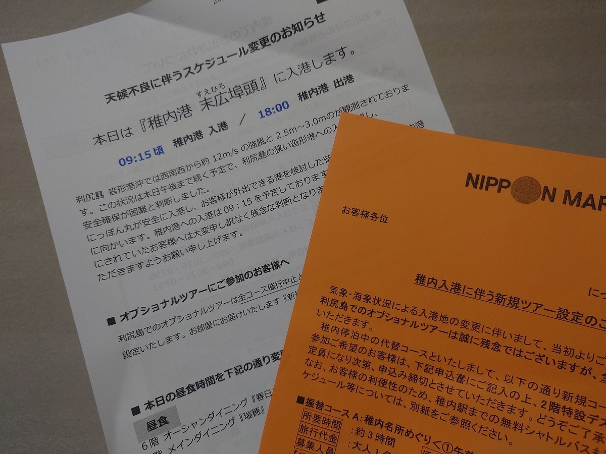 利尻島でのオプショナルツアーは全部中止となるわけですが、急遽行き先を変更した稚内では、稚内市の見どころを回る3時間ほどのツアーを仕立てるとのことで、稚内への行き先変更が決まってから間もなく、お部屋に案内が配布されました。こういう印刷物も、行き先変更が決まってから船内で印刷して配っているのかな。