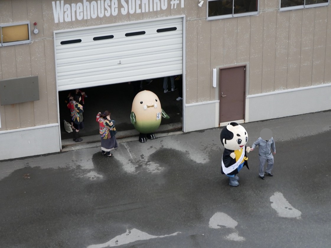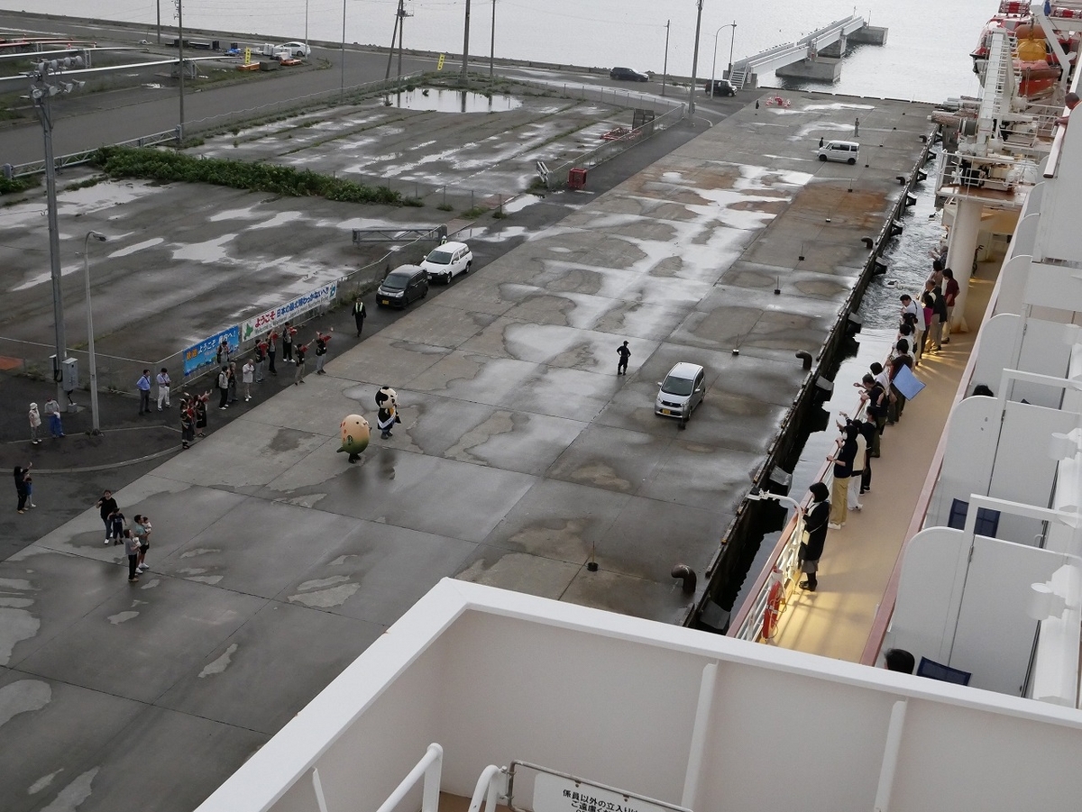 船が出発の準備をしていると、ゆるキャラも倉庫から手を引かれて登場。見送りに来てくれました。なんとなく足取りがおぼつかないのは、急な寄港となり、いつもとは違う人が中に入っていたのかも。