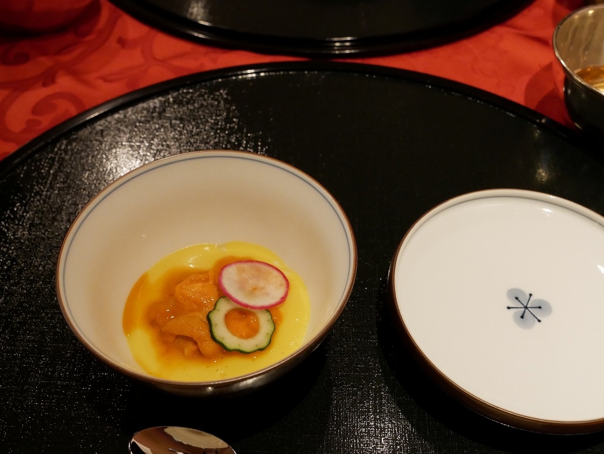 まずは前菜から。ウニって、時々消毒剤の臭いがすることあり、あまり好んで食べないのですが、今回のうにはまったくそんな臭いはなく、トロリのなめらかな食感で美味しいです。これならウニ好きがいるのもわかります。